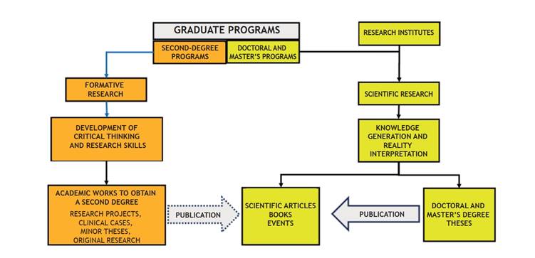 Academic works aim to enrich the professional competencies of future specialists in their respective fields. Unlike the doctoral and master’s programs, these second-degree programs do not seek to train researchers or generate new knowledge; rather, they focus on nurturing critical thinking and research skills through academic works such as research projects, minor theses or monographs, clinical cases or original research. Thus, research output in a second-degree program is linked to FR (Figure 2).