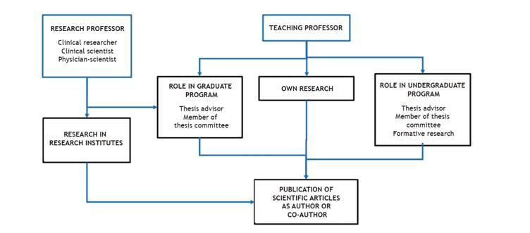 1. Research professors: Individuals primarily dedicated to research and affiliated with research institutes. Current regulations limit their teaching hours, often assigning them only one course per academic year. This scheme operates on the premise that allocating more teaching hours would reduce the time available for research. In addition, the evaluation of their performance usually focuses on the quantity and quality of their publications. This group includes "clinical researchers," if they are engaged in both clinical research and practice; "clinical scientists," who are physicians conducting laboratory research; and "physician-scientists," who do not perform clinical practice and are only focused on research 63.