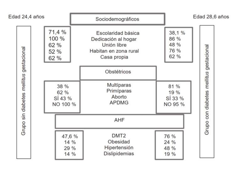 El GcDMG mostró una media de edad significativamente mayor, comparada con el GsDMG, como se muestra en la Figura 1. En el GsDMG, las pacientes tienen predominantemente escolaridad básica, dedicación al hogar, viven en unión libre, habitan en zona rural y cuentan con casa propia. En contraste, las pacientes del GcDMG tienen escolaridad media, también se dedican al hogar, habitan en zona rural y tienen casa propia, pero en su mayoría son casadas. Los antecedentes obstétricos en el GsDMG mostraron que un alto porcentaje de las pacientes son primíparas, no han tenido abortos previos ni antecedentes personales de DMG. Ahora bien, en el GcDMG, las pacientes fueron multíparas, sin antecedente