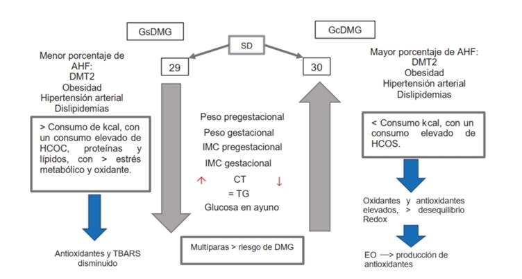 Figura 2 Comparativo de las variables sociodemográficas, antropométricas, bioquímicas, oxidantes/antioxidantes y SDG entre los grupos con y sin DMG