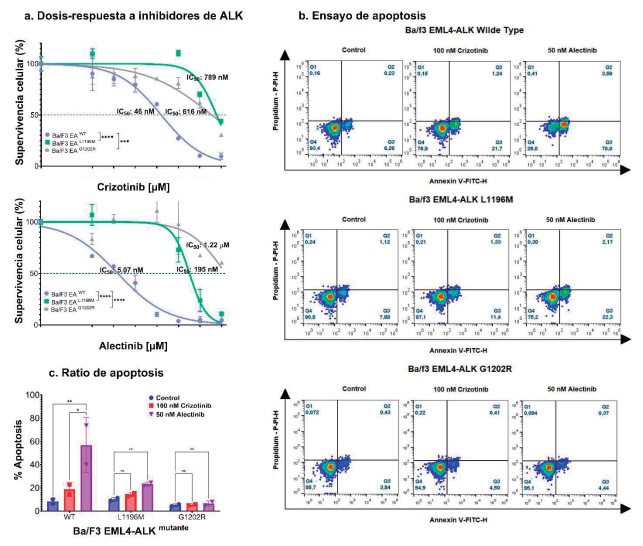 Figura 1 Susceptibilidad farmacológica y ensayo de apoptosis en los modelos celulares. 1a) Evaluación dosis-respuesta de los modelos celulares Ba/F3 EML4-ALK mutante (WT, L1196M, G1202R) a crizotinib y alectinib: WT muestra sensibilidad a crizotinib (IC50: 46 nM) y alectinib (IC50: 5,07 nM), L1196M muestra resistencia a crizotinib (IC50: 789 nM) y sensibilidad a alectinib (IC50: 195 nM) y G1202R muestra resistencia a crizotinib (IC50: 616 nM) y alectinib (IC50: 1220 nM). 1b) Ensayo de apoptosis donde se verifica la susceptibilidad farmacológica de los modelos celulares frente a los tratamientos con crizoonitib y alectinib. 1c) Gráfico de barras donde se representa el ratio de apotosis total.