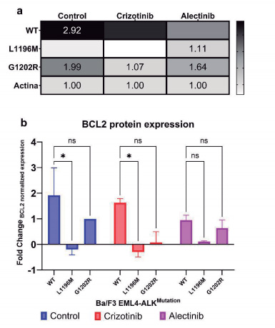 Figura 2 Expresión de la proteína BCL2 en los modelos celulares. 2a) Mapa de calor que representa la cuantificación de la expresión de la proteína BCL2 (valores superiores a 1: sobreexpresión; valores menores a 1: inhibición de la expresión). 2b) Gráfico de barras que muestra la expresión de BCL2 normalizada con el valor de la actina. Los modelos WT y G1202R exhiben la sobreexpresión de BCL2, L1196M exhibe la expresión de BCL2 cercana a la basal.