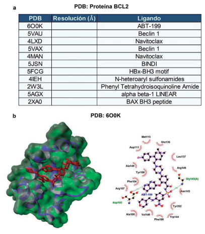 Figura 3 Proteína BCL2 (PDB: 6O0K) y su ligando ABT-199. 3a) Lista de PDB públicos descargados de la plataforma RSCB-PDB (https://www.rcsb.org), ordenados según el nivel de resolución. 3b) En la izquierda, la estructura tridimensional del PDB 6O0K (BCL2 en azul-verde, interaccionando con el ligando ABT-199 en rojo), y en la derecha, la interacción bidimensional del ligando ABT-199 con aminoácidos específicos dentro del sitio catalítico de BCL2 (imagen generada en LigPlot).