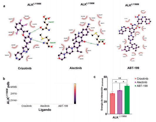Figura 4 Energías de interacción evidencian a ABT-199 como candidato de unión al sitio activo de la proteína ALKL1196M. 4a) Ligandos crizotinib, alectinib y ABT-199 interactúan con aminoácidos específicos del sitio activo de la proteína ALKL1196M (imagen generada en LigPlot). 4b) Mapa de calor muestra las energías de interacción entre las estructuras de ALKL1196M con crizotinib, alectinib y ABT-199. 4c) Gráfico de barras muestra el promedio de las energías de interacción, donde destaca ABT-199 con energía de interacción superior a crizotinib y alectinib.