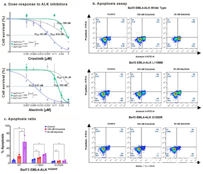 Figure 1. Pharmacological susceptibility and apoptosis assay in cell models. 1a) Dose-response assessment of Ba/F3 EML4-ALK mutant cell models (WT, L1196M, G1202R) to crizotinib and alectinib: WT shows sensitivity to crizotinib (IC50: 46 nM) and alectinib (IC50: 5.07 nM), L1196M shows resistance to crizotinib (IC50: 789 nM) and sensitivity to alectinib (IC50: 195 nM) and G1202R shows resistance to crizotinib (IC50: 616 nM) and alectinib (IC50: 1,220 nM). 1b) Apoptosis assay verifying the pharmacological susceptibility of the cell models to treatments with crizonitib and alectinib. 1c) Bar graph representing the total apoptosis ratio.