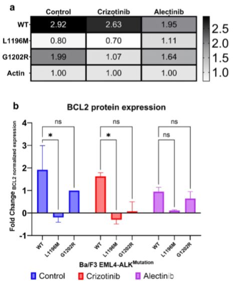 Figure 2. BCL2 protein expression in the cell models. 2a) Heatmap representing the quantification of BCL2 protein expression (values greater than 1: overexpression; values less than 1: inhibition of expression). 2b) Bar graph showing BCL2 expression normalized to actin value. The WT and G1202R models exhibit BCL2 overexpression, while L1196M shows BCL2 expression close to baseline.