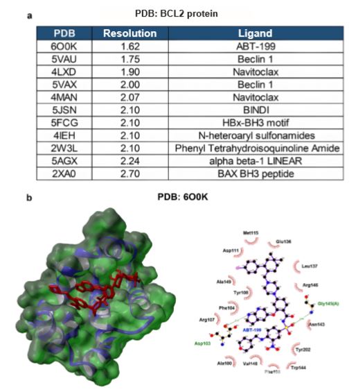 Figure 3. BCL2 protein (PDB: 6O0K) and its ABT-199 ligand. 3a) List of public PDBs downloaded from the RSCB-PDB platform (https://www.rcsb.org), sorted by resolution level. 3b) On the left, the three-dimensional structure of PDB 6O0K (BCL2 in blue-green, interacting with the ABT-199 ligand in red), and on the right, the two-dimensional interaction of the ABT-199 ligand with specific amino acids within the catalytic site of BCL2 (image generated using LigPlot).