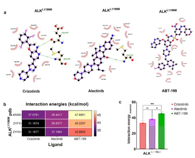Figure 4. Interaction energies evidence ABT-199 as a candidate for binding to the active site of the ALKL1196M protein. 4a) Crizotinib, alectinib and ABT-199 ligands interact with specific amino acids of the ALKL1196M protein active site (image generated using LigPlot). 4b) The heatmap shows the interaction energies between ALKL1196M structures with crizotinib, alectinib and ABT-199. 4c) Bar graph shows the average interaction energies, where ABT-199 stands out with an interaction energy higher than that of crizotinib and alectinib.