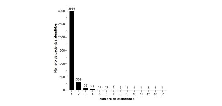Respecto a la frecuencia con que los pacientes necesitarían una o más atenciones, se encontró que el requerimiento de una atención se dio en 2988 pacientes, mientras que 308 pacientes precisaron dos atenciones. El número máximo de atenciones registradas fue 32 en un solo paciente (Figura 1), por lo que la intensidad de uso general fue 1,25 (4338 atenciones y 3463 personas atendidas). Con relación a los estratos, este indicador en pacientes de 60 a más años fue 1,32 (1055 atenciones y 798 pacientes atendidos), entre varones fue 1,27 (1657 atenciones y 1305 pacientes atendidos) y en el nivel de complejidad I fue 1,28 (2543 atenciones y 1994 pacientes atendidos).