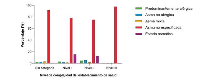 Se identificó que, en el nivel III, el diagnóstico de asma no especificada representó el 97,72 % (n = 1244) de las atenciones; en el nivel I, el 78,37 % (n = 87); en el nivel II, el 75,22 % (n = 258), y en los que no tenían categoría, el 91,58 % (n = 1993) de las atenciones (Figura 2).