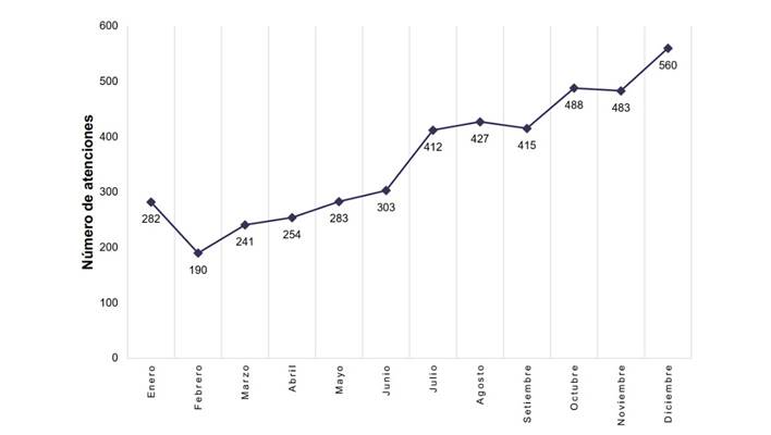 Se observó un aumento del número de atenciones a lo largo del año. En enero, se registraron 282 atenciones y en diciembre 560; este fue el mes con el número más alto de atenciones del 2021 (Figura 3).