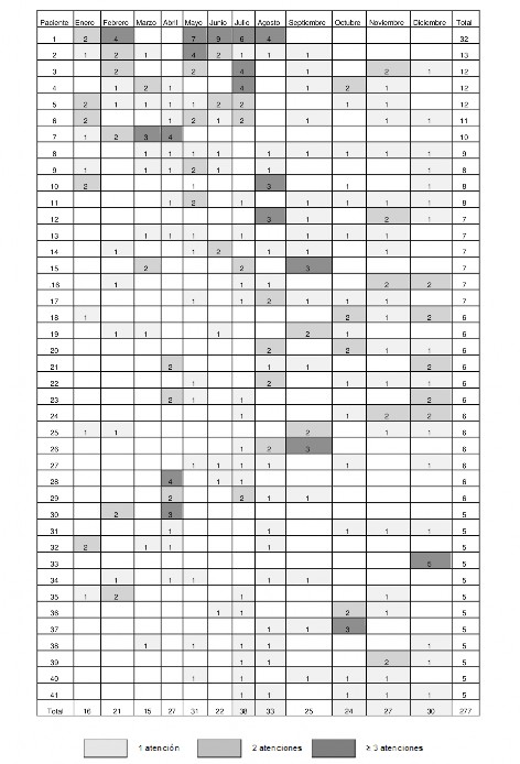 En los servicios de emergencia, se registraron 41 pacientes que tuvieron cinco o más atenciones por diagnóstico de asma. El paciente con mayor cantidad de atenciones, que fue 32, tuvo mayor recurrencia de atenciones entre mayo y agosto. Los 41 pacientes tuvieron una mayor cantidad de recurrencia durante los meses de abril a agosto (n = 151 atenciones) (Tabla 2).