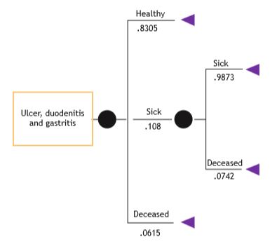 Regarding transitions related to ulcer, gastritis and duodenitis,10.8 % of individuals transitioned to the “sick” state, 98.73 % remained in the “sick” state and 7.42 % progressed to the “deceased” state (Figure 1).
