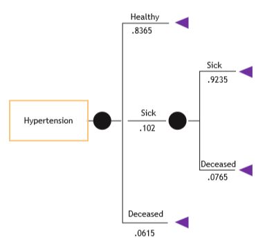 In the case of hypertension, 10.2 % of individuals transitioned from the “healthy” to the “sick” state, 92.35 % remained in the “sick” state and 7.65 % progressed to the “deceased” state (Figure 2).
