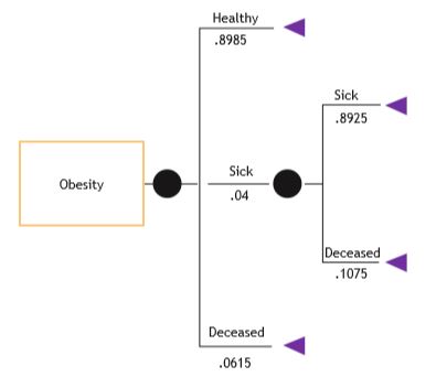 In the case of obesity, 4.00 % of individuals transitioned to the “sick” state, 89.25 % remained in the “sick” state and 10.75 % progressed to the “deceased” state (Figure 4).