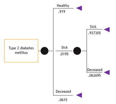 In the case of type 2 diabetes mellitus, 1.95 % of individuals transitioned from the “healthy” to the “sick” state, 93.73 % remained in the “sick” state and 6.2 % progressed to the “deceased” state (Figure 3).