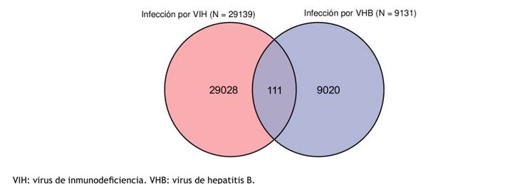 Inicialmente la base de datos contenía 111 personas, fueron excluidos cinco participantes por no cumplir con los criterios de elegibilidad: cuatro menores de 18 años y uno perteneciente al 2022. Finalmente, se incluyeron 106 participantes con VIH y VHB.
