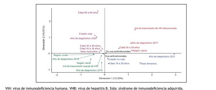 Se realizó un análisis de correspondencias múltiples con las variables edad al momento del diagnóstico, sexo, lugar de residencia, año de diagnóstico de la coinfección, estadio sida, vía de transmisión de VIH y uso de ARV. La edad al diagnóstico fue categorizada en de 18 a 29 años, 30 a 39 años, 40 a 49 años, 50 a 59 años y 60 a 69 años. Para este análisis se excluyeron a los participantes con algún dato ausente.