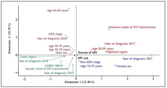 Four participants were excluded due to missing data, and 102 participants were included in this analysis. The category year of diagnosis 2020 was associated with the categories male sex, AIDS stage, and age groups 30-39, 40-49, and 60-69 years. Similarly, the category year of diagnosis 2017 was associated with the categories region of residence in the highlands, age 50-59 years and unknown route of HIV transmission. On the other hand, the category year of diagnosis 2021 was associated with the categories age 18-29 years, non-AIDS stage and female sex. Finally, the category year of diagnosis 2019 was associated with the categories year of diagnosis 2018, region of residence in the coast, region of residence in the jungle, and sexual route of HIV transmission. The categories ARV use and nonuse of ARV were not associated with other categories (Figure 2).