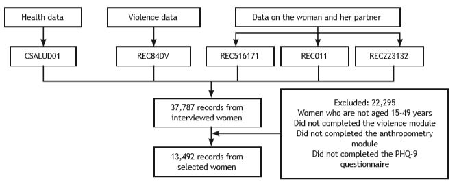 We included in our analysis the records from WCA who completed the Patient Health Questionnaire (PHQ-9), anthropometry module and violence module. We excluded the records from WCA with underweight (body mass index [BMI] < 18.5) and those lacking information for the aforementioned modules and questionnaires.