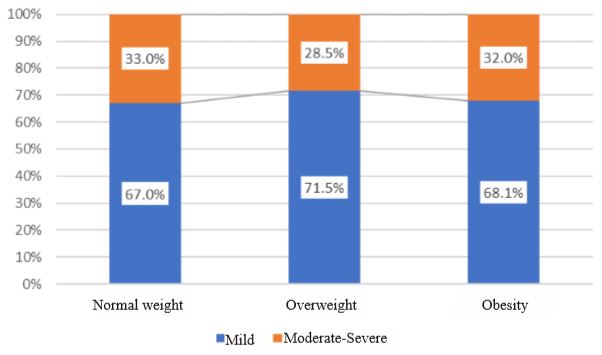 A descriptive graph representing the proportion of severity of DS among individuals with normal weight, overweight and obesity shows a similar distribution across the three categories. A slight difference is noted in obesity group compared to the overweight group, increasing the proportion of individuals with moderate-severe symptoms with respect to mild symptoms (Figure 3).