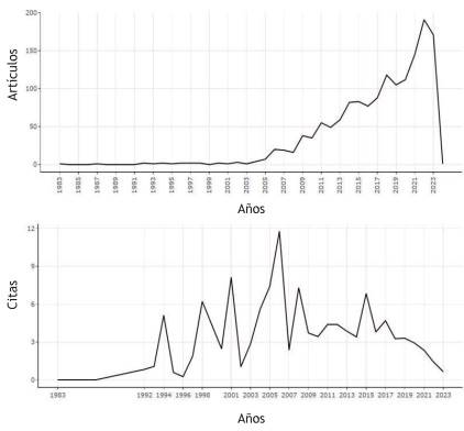 Inicialmente, se identificaron 1519 documentos, de los cuales, tras aplicar los criterios de inclusión, se seleccionaron 1496, con ventana de tiempo entre 1983 y 2023. El 70,7 % (n = 1059) de la producción total consistió en artículos originales, seguido de revisiones (n = 357; 23,8 %). Se identificaron 5832 autorías, 125 (8,3 %) documentos con autoría única y se precisó una colaboración internacional en el 15,6 % de los artículos (Tabla 1). Desde el año 1983, ha existido un crecimiento sostenido de la producción científica, con un incremento marcado en los últimos 13 años, donde 2022 fue el año más prolífico (n = 191 documentos publicados) (Figura 1A). Por el contrario, la evolución de las citas ha mostrado una fluctuación: el 2006 fue el año en que se recibió más citas, mientras que, en los últimos cinco años, se ha observado una disminución sostenida (Figura 1B).