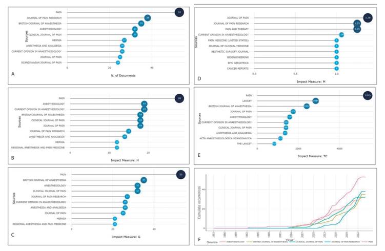 En cuanto a las revistas, se observó que el mayor número de documentos se había publicado en revistas de alto impacto, tales como Pain (n = 53; SJR: Q1), Journal of Pain Research (n = 38; SJR: Q2) y British Journal of Anaesthesia (n = 35; SJR: Q1) (Figura 2A). Al valorar el impacto, según el índice h, la revista Pain (índice h = 28) lidera esta métrica, seguida de Anesthesiology y Current Opinion in Anaesthesiology (índice h = 19 para ambos casos) (Figura 2B). De acuerdo con los índices g y m, Pain (índice g = 53) y Journal of Pain (índice m = 1,38) son las revistas con el mayor impacto (Figuras 2C y 2D). No obstante, Pain y Lancet son las revistas que han acumulado el mayor número de citas a lo largo del tiempo (5375 y 2844 citas, respectivamente) (Figura 2E). Aun así, el mayor crecimiento en volumen de publicación lo presentan las revistas Pain y Journal of Pain Research, sobre todo en los últimos 10 años (Figura 2F).
