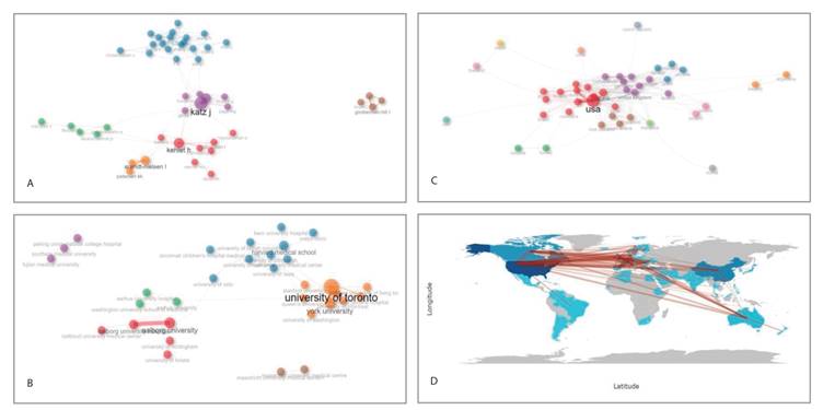 Figura 3 Redes de colaboración y fuerza de la colaboración regional e internacional en investigación global sobre dolor crónico postoperatorio. A. Colaboración entre autores. B. Colaboración entre afiliaciones. C. Colaboración entre países. D. Frecuencia de colaboración regional e internacional.