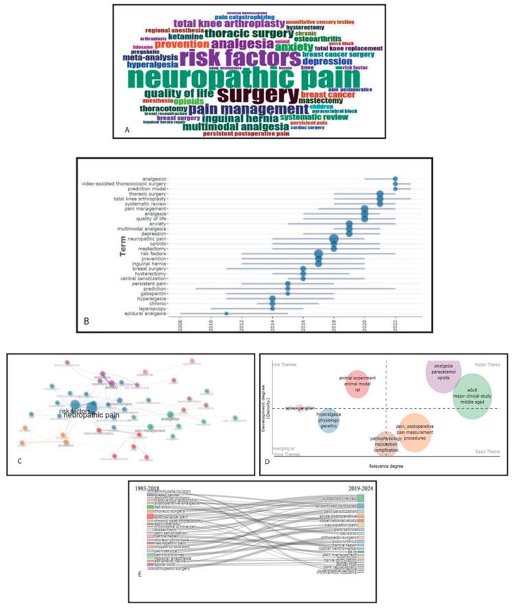 Figura 4 Tópicos calientes y tendencias en investigación global sobre dolor crónico postoperatorio. A. Nube de palabras clave en forma de bigramas más frecuentes. B. Frecuencia de tópicos a lo largo del tiempo. C. Red de coocurrencia de términos que conforman los tópicos en investigación. D. Mapa temático de las tendencias en investigación. E. Transición de tendencias a lo largo del tiempo.