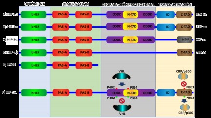Dominios de las subunidades del HIF-1α (A-C), HIF-1β (D, E). Activación e inhibición del HIF-1α (F): en hipoxia los residuos de prolina en posiciones 402 y 564 sufren hidroxilación por la PH1-3 (rojo), lo que atrae a la proteína de VHL que inicia la ubiquitinación y posterior destrucción proteosomal de la proteína HIF-1α; en normoxia no existe hidroxilación (verde), por tanto, no hay ligazón a VLH y HIF-1α no se destruye. La hidroxilación del residuo de asparagina en posición 803 (rojo) por la enzima FIH inhibe CBP/p300 y HIF-1α, no puede llegar al ADN para generar transcripción genética, independientemente de VHL.