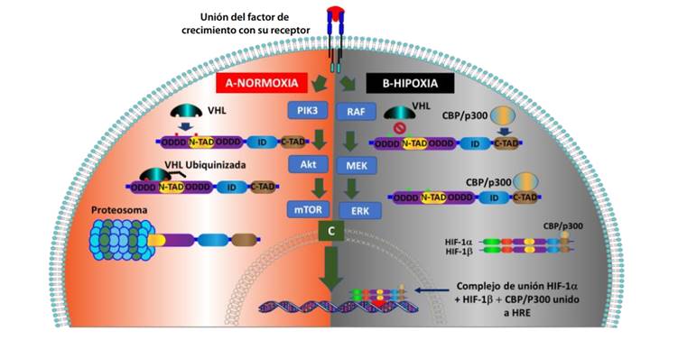 A) En normoxia, la pVHL es atraída por el HIF-1α e inicia el proceso de ubiquitinación, luego se produce su degradación, por consiguiente, no permite que el complejo de unión llegue al núcleo y provoque la transducción genética. B) En hipoxia, VHL no se une al HIF-1α, por tanto, no se degrada y logra unirse con HIF-1β y con CBP/P300 y llegar al núcleo para activar el elemento de respuesta hormonal (HRE) e iniciar la transcripción de genes. C) Las activaciones generadas por vías de señalización importante como PIK3 y MAPK, en células malignas, pueden resultar en transducción genética directa independiente de la condición de O₂.
