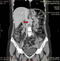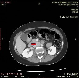 Figura 1 Estudio de tomografía computarizada del abdomen: masa sólida de bordes definidos ubicada en el espacio retroperitoneal de la región intercava