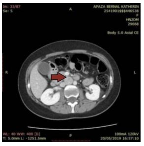 Figure 1. Abdominal CT scan showing a solid mass with defined borders located in the retroperitoneal intercaval region