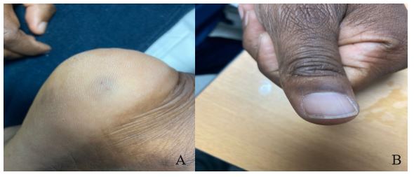 Figure 1. Clinical manifestations due to vascular phenomena. A) Osler node on the right heel. B) Splinter hemorrhage under the nail of the first digit of the right hand (Table 1).