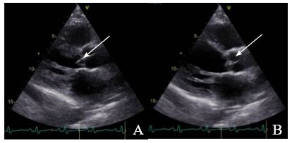 Figure 2. Transthoracic echocardiogram showing vegetation on the native aortic valve. A) and B) Closed aortic valve.