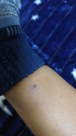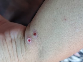 La paciente 2, una mujer de 27 años, procedente de Lima, trabajadora doméstica, refirió convivir con el paciente 1. Como antecedentes presentó obesidad y anemia, y era puérpera de tres meses. Luego de seis días de la exposición por contacto estrecho con el paciente 1 (manipulación de la lesión paular, contacto sexual, uso de ropa de cama y contacto prolongado), presentó múltiples lesiones vesiculares y pustulares (Figura 2 y Figura 3) en diferentes zonas del cuerpo (cuatro en el tórax, dos en el abdomen, una en la orofaringe, seis en los miembros superiores derecho e izquierdo, tres en los miembros inferiores y tres lesiones en la región anal). Además de ello, se adicionaron mialgias, fiebre, odinofagia y dolor anal con sangrado al realizar deposiciones. La paciente se automedicó con paracetamol y solicitó una evaluación médica. Tras realizarse esta, se sospechó de viruela símica, de modo que se solicitó la prueba de Monkeypox Virus RT-PCR (reacción en cadena de polimerasa en tiempo real para viruela del mono), con resultado positivo específico para el MPXV (INS). Se hizo el seguimiento por telemonitoreo y se realizó una visita domiciliaria posterior. Ambos pacientes pernoctaban en una habitación con sus dos hijos: uno de ocho años (paciente 3) y un lactante de tres meses (contacto 1).