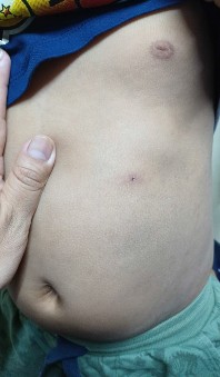 El paciente 3, un niño de ocho años, hijo de la pareja de pacientes 1 y 2, sin comorbilidades, presentó síntomas a los siete días de iniciados los de la madre (paciente 2): odinofagia, tinnitus, fiebre, malestar general, adenopatía cervical y, posteriormente, aparición de diversas lesiones en el cuello presentadas como pápulas umbilicadas y costrosas. Estas lesiones también estuvieron presentes en la región abdominal (Figura 4), el brazo izquierdo y el glúteo derecho. En el establecimiento de salud fue diagnosticado de pansinusitis, otomastoiditis, amigdalitis adenoiditis severa y enfermedad por viruela del mono, por lo que recibió tratamiento con ceftriaxona y clindamicina. Se solicitó la prueba de Monkeypox Virus RT-PCR, con resultado positivo específico para el MPXV.