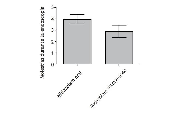 En un estudio previo sobre la comparación del nivel de sedación del midazolam administrado por vía oral y endovenosa, no se encontró diferencia significativa en el nivel de sedación entre los grupos (p > 0.05) 14. Esta observación se ha reflejado en estudios comparativos con otros sedantes, como meperidina 15, propofol 16 y diazepam 17,18, los cuales mostraron que no hubo diferencias en cuanto a la ansiedad, el malestar/dolor, y la amnesia anterógrada -producida por el midazolam oral, la cual fue mayor (RR 0,45; IC del 95 %: 0,30 a 0,66) 19.