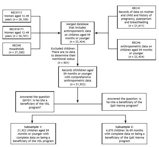 The ENDES targeted women aged 12- 49 years and their children aged five years or younger who were residents of the selected household. It also included those women that stayed overnight in the dwelling the night before the day of the interview, even if they were not usual residents. In our study, the inclusion criteria were the following: 1) woman aged 15-49 years living with a child aged five years or younger, 2) child with comprehensive anthropometric data measurement, and 3) mothers who answered the questions aimed at identifying the coverage of the VDL (subsample 1) and QW (subsample 2) programs. Based on the last selection criterion, two study groups were defined.