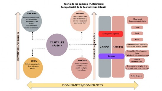 Del análisis de las RS de la desnutrición infantil desde la teoría de los campos, se pudo observar que existieron diferencias entre los capitales desde la mirada de la comunidad wichí con respecto a la de los profesionales. Para los profesionales sanitarios y organizaciones sociales, el capital económico, entendido como "recursos e insumos institucionales", fue más importante que los otros capitales; mientras que para la comunidad wichí, los que tuvieron más peso fueron el económico en interrelación con el cultural, que incluyeron la capacidad de autosustento y los facilitadores interculturales.