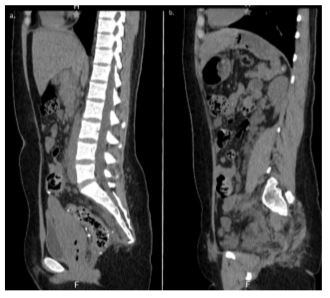 Figure 1. Abdominal MRI scan in the sagittal plane with contrast. 1a) Colorectal wall showing angioembolizations and lumbar spine with loss of lordosis. 1b) Heterogeneous findings in the pelvic region consistent with sequelae of arteriovenous malformations.