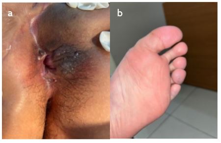 Figure 2. Clinical presentation. 2a) Lipomatous growth. 2b) Petechiae on the plantar region and fourth toe; port-wine stains on the plantar region.