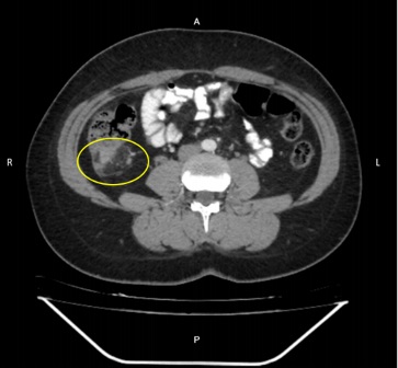 Paciente femenina, que cursa la tercera década de la vida, con antecedente de apendicetomía hace siete años, ingresó a clínica de tercer nivel por un cuadro de una semana de evolución caracterizado por dolor abdominal localizado en la fosa iliaca derecha, sin fiebre ni vómitos ni otra sintomatología. Al examen físico, presentó abdomen globoso a expensas de abundante panículo adiposo, levemente doloroso a la palpación en la fosa iliaca derecha, sin signos de irritación peritoneal. Sus signos vitales fueron estables: frecuencia cardiaca de 72 latidos por minuto, tensión arterial 115/75 mmHg, temperatura 36 °C. El recuento total de glóbulos blancos fue de 13 400 mm3 (90 % de neutrófilos). Finalmente, la ecografía de abdomen total estuvo dentro de los límites normales, por lo que se solicitó una tomografía axial computarizada (TAC) de abdomen total, donde se evidenció apendicitis aguda con cambios inflamatorios regionales (Figura 1).