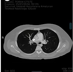 La sintomatología inició con un dolor precordial opresivo, que el paciente calificó como 10/10 en la escala visual análoga (EVA), el cual se veía exacerbado a la inspiración profunda, sin atenuantes ni irradiaciones. Posteriormente, presentó disnea ante pequeños esfuerzos y síncope de un minuto de duración, caída de su propia altura y contusión en la rodilla y el cráneo. Ingresó al hospital general de la zona con dolor precordial y pulsioximetría al 85 %. El electrocardiograma (EKG) evidenció taquicardia sinusal (122 lpm) y patrón de McGinn-White (S1-Q3-T3) (Figura 1). La serología reportó dímero D 1795 µg/dl, CPK 113 mg/dl, CPK MB 17,1 mg/dl. La angiotomografía evidenció tromboembolia pulmonar en las ramas principales, segmentarias y subsegmentarias (Figura 2). Se inició tratamiento de anticoagulación con enoxaparina y se refirió al paciente a unidad terciaria.