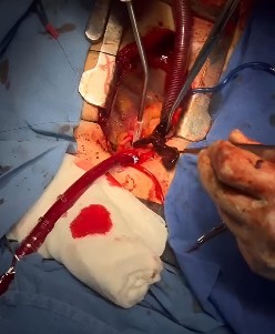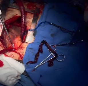Ingresó a la unidad hermodinámicamente estable, taquicárdico, neurológicamente íntegro, con apoyo de oxígeno por puntas nasales. Tras ser valorado por el servicio de hemodinamia, se determinó que no era candidato a trombectomía mecánica por intervencionismo debido a que presentaba estabilidad hemodinámica y por encontrarse en ventana para fibrinólisis; sin embargo, durante la evolución hospitalaria presentó inestabilidad hemodinámica con presión arterial sistólica (PAS) <90 mmHg, por lo que se clasificó como PESI IV (riesgo de muerte alto). Se acepta por cirugía de tórax para trombectomía mecánica, e ingresó al quirófano, donde se encontró un trombo en las ramas principales y confluencia (Figura 3), el cual se extrajo sin eventualidades (Figura 4). Finalmente, ingresó a la unidad de cuidados intensivos para cuidados posquirúrgicos, con evolución favorable y posterior egreso sin eventualidades.