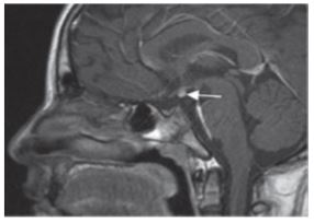 Figure 1. Contrast-enhanced pituitary MRI (gadolinium), sagittal view: decreased adenohypophysis height without focal lesions