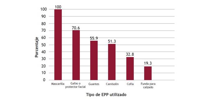 Respecto al uso de EPP, el 71,43 % (n = 170) refirió usarlo siempre; el 23,53 % (n = 56), la mayor parte del tiempo; el 3,78 % (n = 9), ocasionalmente, y, finalmente, dos trabajadores no contestaron a la pregunta y uno refirió no saber cuándo está indicado su uso. Respecto a los 7 EPP recomendados, el 55,04 % de los participantes declaró usar < 4 (n = 131), el 36,13 % (n = 86) entre 4 y 6, y solo el 8,82 % (n = 21) declaró usar los 7 EPP. Respecto al tipo de EPP utilizado con más frecuencia, se mencionó que la mascarilla y las gafas fueron los más usados; por el contrario, la cofia y las fundas de calzado, los menos utilizados (Figura 1).