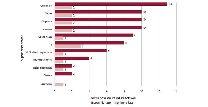 En el grupo de participantes que reportó haber tenido algún síntoma durante la primera fase del estudio, la seroprevalencia fue del 1,94 % (0,54-6,81), mientras que en aquellos que no refirieron síntomas (p = 0,75) fue del 2,17 % (0,82-6,34). La tos, seguida de la anosmia-disgeusia, el cansancio y la fiebre, fueron los síntomas asociados a una mayor prevalencia de casos reactivos.