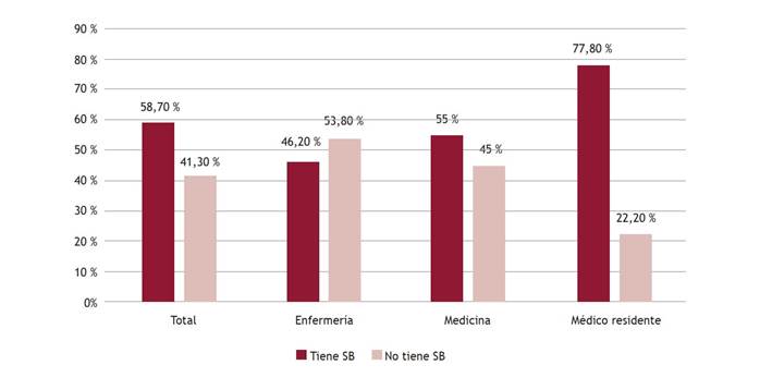 Se observó una prevalencia global del SB del 58,70 %: 77,80 % de los residentes, 55 % del personal médico y 46,20 % del personal de enfermería (Figura 1).