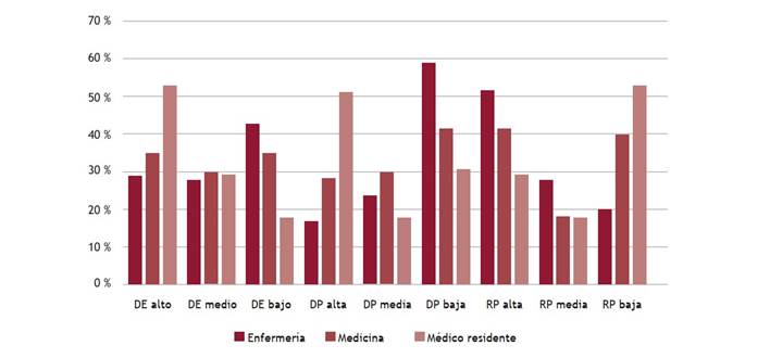 Al analizar el SB por dimensión y tipo de personal, se encontró que los mayores porcentajes para desgaste emocional (DE) alto y despersonalización (DP) alto se presentaron en los residentes, con 52,80 % y 51,40 % respectivamente. Asimismo, los residentes obtuvieron el mayor porcentaje de realización personal (RP) baja, con 52,80 % (Figura 2).